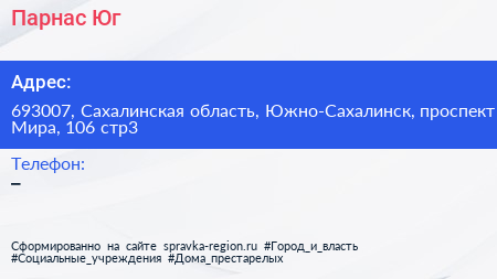Парнас-Юг по адресу 693007, Сахалинская область, Южно-Сахалинск, проспект Мира, 106 стр3 в дальнейшем Организация, размещена в следующих категориях: