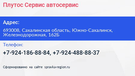 Плутос-Сервис, автосервис по адресу 693008, Сахалинская область, Южно-Сахалинск, Железнодорожная, 162Б в дальнейшем Организация, размещена в следующих категориях: