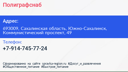 Полиграфснаб по адресу 693009, Сахалинская область, Южно-Сахалинск, Коммунистический проспект, 49 в дальнейшем Организация, размещена в следующих категориях: