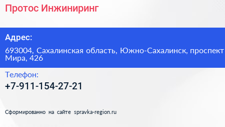 Протос Инжиниринг по адресу 693004, Сахалинская область, Южно-Сахалинск, проспект Мира, 426 в дальнейшем Организация, размещена в следующих категориях: