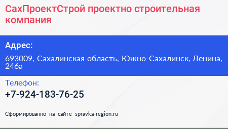 СахПроектСтрой, проектно-строительная компания по адресу 693009, Сахалинская область, Южно-Сахалинск, Ленина, 246а в дальнейшем Организация, размещена в следующих категориях: