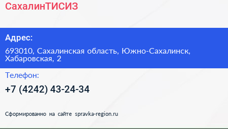 СахалинТИСИЗ по адресу 693010, Сахалинская область, Южно-Сахалинск, Хабаровская, 2 в дальнейшем Организация, размещена в следующих категориях: