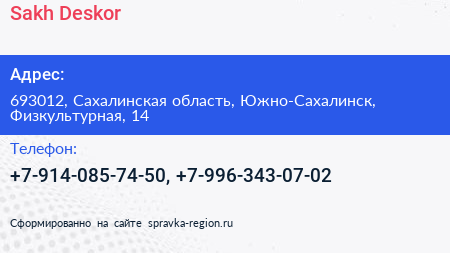 Sakh Deskor по адресу 693012, Сахалинская область, Южно-Сахалинск, Физкультурная, 14 в дальнейшем Организация, размещена в следующих категориях: