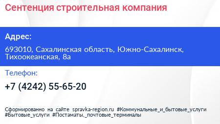 Сентенция, строительная компания по адресу 693010, Сахалинская область, Южно-Сахалинск, Тихоокеанская, 8а в дальнейшем Организация, размещена в следующих категориях: