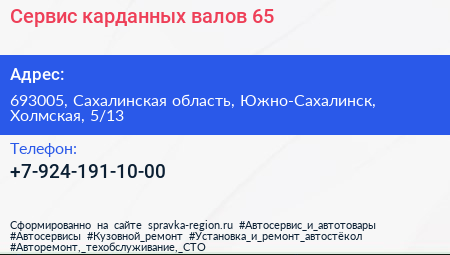 Сервис карданных валов 65 по адресу 693005, Сахалинская область, Южно-Сахалинск, Холмская, 5/13 в дальнейшем Организация, размещена в следующих категориях: