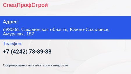 СпецПрофСтрой по адресу 693006, Сахалинская область, Южно-Сахалинск, Амурская, 187 в дальнейшем Организация, размещена в следующих категориях: