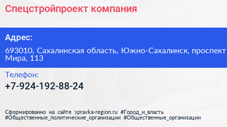 Спецстройпроект, компания по адресу 693010, Сахалинская область, Южно-Сахалинск, проспект Мира, 113 в дальнейшем Организация, размещена в следующих категориях: