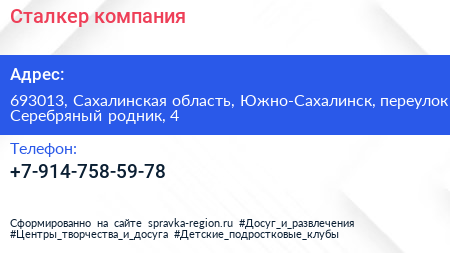 Сталкер, компания по адресу 693013, Сахалинская область, Южно-Сахалинск, переулок Серебряный родник, 4 в дальнейшем Организация, размещена в следующих категориях: