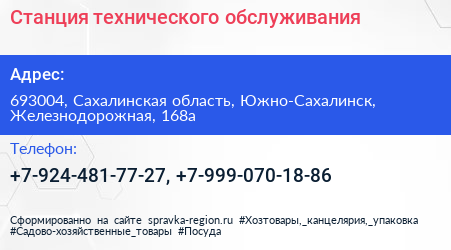 Станция технического обслуживания по адресу 693004, Сахалинская область, Южно-Сахалинск, Железнодорожная, 168а в дальнейшем Организация, размещена в следующих категориях: