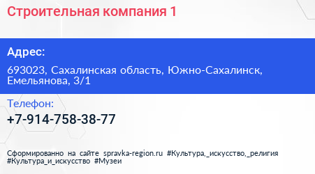 Строительная компания № 1 по адресу 693023, Сахалинская область, Южно-Сахалинск, Емельянова, 3/1 в дальнейшем Организация, размещена в следующих категориях: