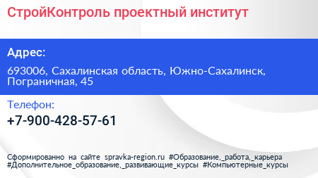 СтройКонтроль, проектный институт по адресу 693006, Сахалинская область, Южно-Сахалинск, Пограничная, 45 в дальнейшем Организация, размещена в следующих категориях: