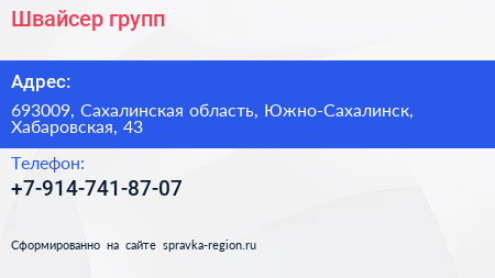 Швайсер групп по адресу 693009, Сахалинская область, Южно-Сахалинск, Хабаровская, 43 в дальнейшем Организация, размещена в следующих категориях: