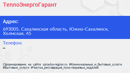 ТеплоЭнергоГарант по адресу 693005, Сахалинская область, Южно-Сахалинск, Холмская, 45 в дальнейшем Организация, размещена в следующих категориях: