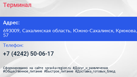 Терминал по адресу 693009, Сахалинская область, Южно-Сахалинск, Крюкова, 57 в дальнейшем Организация, размещена в следующих категориях: