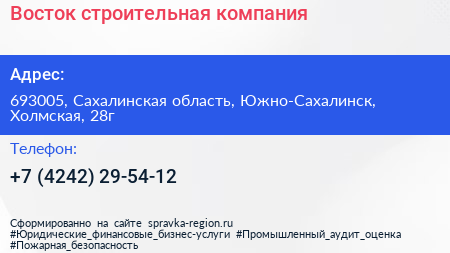 Восток, строительная компания по адресу 693005, Сахалинская область, Южно-Сахалинск, Холмская, 28г в дальнейшем Организация, размещена в следующих категориях: