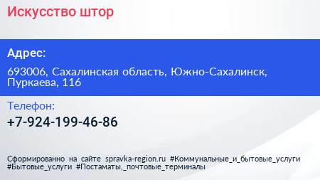 Искусство штор по адресу 693006, Сахалинская область, Южно-Сахалинск, Пуркаева, 116 в дальнейшем Организация, размещена в следующих категориях: