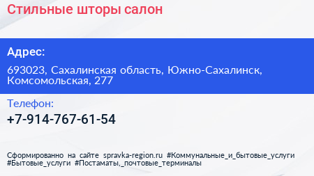 Стильные шторы, салон по адресу 693023, Сахалинская область, Южно-Сахалинск, Комсомольская, 277 в дальнейшем Организация, размещена в следующих категориях: