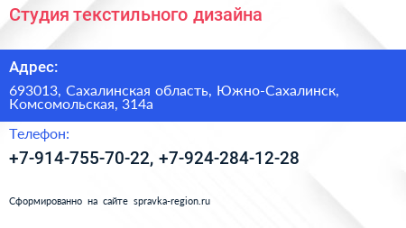 Студия текстильного дизайна по адресу 693013, Сахалинская область, Южно-Сахалинск, Комсомольская, 314а в дальнейшем Организация, размещена в следующих категориях: