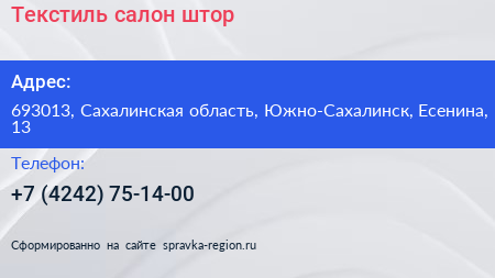 Текстиль, салон штор по адресу 693013, Сахалинская область, Южно-Сахалинск, Есенина, 13 в дальнейшем Организация, размещена в следующих категориях: