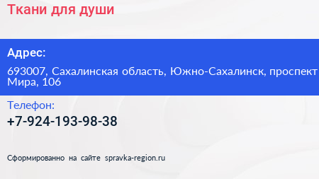 Ткани для души по адресу 693007, Сахалинская область, Южно-Сахалинск, проспект Мира, 106 в дальнейшем Организация, размещена в следующих категориях: