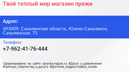Твой теплый мир, магазин пряжи по адресу 693009, Сахалинская область, Южно-Сахалинск, Сахалинская, 71 в дальнейшем Организация, размещена в следующих категориях: