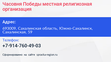 Часовня Победы, местная религиозная организация по адресу 693009, Сахалинская область, Южно-Сахалинск, Сахалинская, 59 в дальнейшем Организация, размещена в следующих категориях: