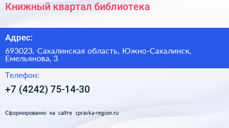 Книжный квартал, библиотека по адресу 693023, Сахалинская область, Южно-Сахалинск, Емельянова, 3 в дальнейшем Организация, размещена в следующих категориях: