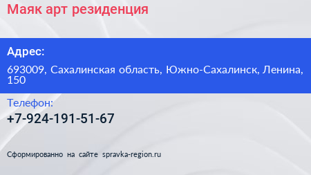 Маяк, арт-резиденция по адресу 693009, Сахалинская область, Южно-Сахалинск, Ленина, 150 в дальнейшем Организация, размещена в следующих категориях: