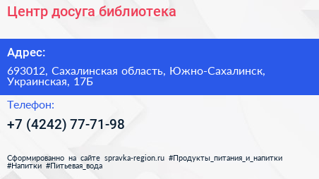 Центр досуга, библиотека по адресу 693012, Сахалинская область, Южно-Сахалинск, Украинская, 17Б в дальнейшем Организация, размещена в следующих категориях: