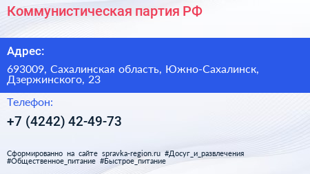 Коммунистическая партия РФ по адресу 693009, Сахалинская область, Южно-Сахалинск, Дзержинского, 23 в дальнейшем Организация, размещена в следующих категориях: