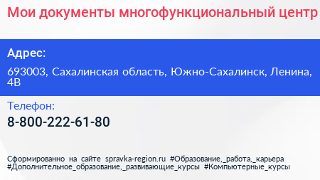 Мои документы, многофункциональный центр по адресу 693003, Сахалинская область, Южно-Сахалинск, Ленина, 4В в дальнейшем Организация, размещена в следующих категориях: