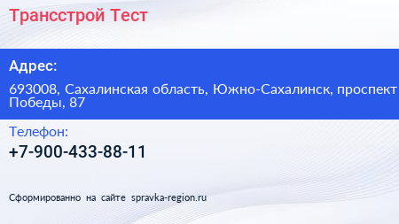 Трансстрой-Тест по адресу 693008, Сахалинская область, Южно-Сахалинск, проспект Победы, 87 в дальнейшем Организация, размещена в следующих категориях: