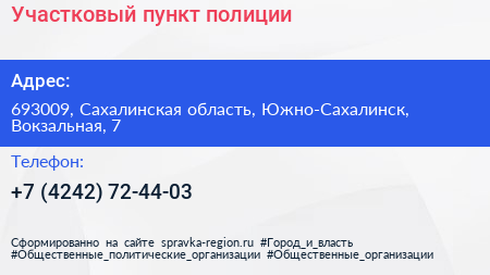 Участковый пункт полиции по адресу 693009, Сахалинская область, Южно-Сахалинск, Вокзальная, 7 в дальнейшем Организация, размещена в следующих категориях: