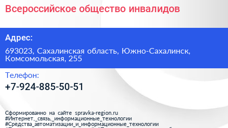 Всероссийское общество инвалидов по адресу 693023, Сахалинская область, Южно-Сахалинск, Комсомольская, 255 в дальнейшем Организация, размещена в следующих категориях: