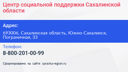 Центр социальной поддержки Сахалинской области по адресу 693006, Сахалинская область, Южно-Сахалинск, Пограничная, 33 в дальнейшем Организация, размещена в следующих категориях: