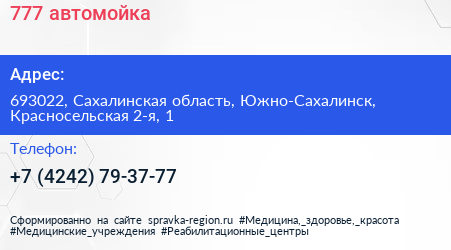 777, автомойка по адресу 693022, Сахалинская область, Южно-Сахалинск, Красносельская 2-я, 1 в дальнейшем Организация, размещена в следующих категориях: