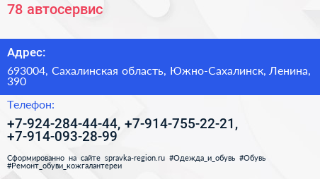 78, автосервис по адресу 693004, Сахалинская область, Южно-Сахалинск, Ленина, 390 в дальнейшем Организация, размещена в следующих категориях: