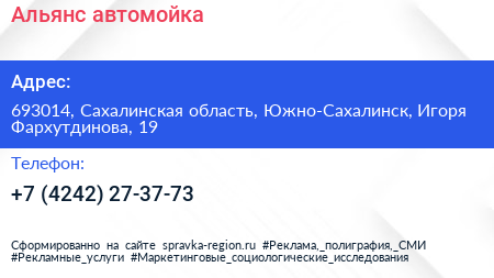 Альянс, автомойка по адресу 693014, Сахалинская область, Южно-Сахалинск, Игоря Фархутдинова, 19 в дальнейшем Организация, размещена в следующих категориях: