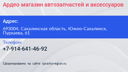 Ардео, магазин автозапчастей и аксессуаров по адресу 693004, Сахалинская область, Южно-Сахалинск, Пуркаева, 61 в дальнейшем Организация, размещена в следующих категориях: