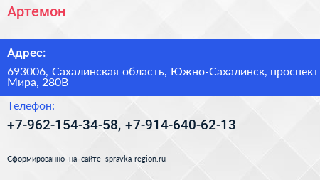 Артемон по адресу 693006, Сахалинская область, Южно-Сахалинск, проспект Мира, 280В в дальнейшем Организация, размещена в следующих категориях: