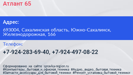 Атлант 65 по адресу 693004, Сахалинская область, Южно-Сахалинск, Железнодорожная, 166 в дальнейшем Организация, размещена в следующих категориях: