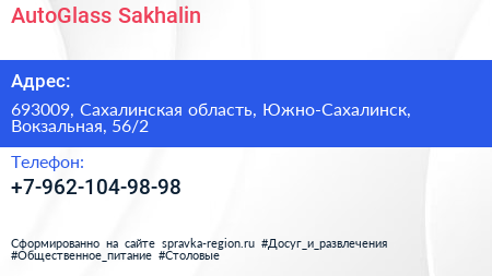 AutoGlass Sakhalin по адресу 693009, Сахалинская область, Южно-Сахалинск, Вокзальная, 56/2 в дальнейшем Организация, размещена в следующих категориях: