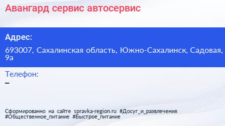 Авангард сервис, автосервис по адресу 693007, Сахалинская область, Южно-Сахалинск, Садовая, 9а в дальнейшем Организация, размещена в следующих категориях: