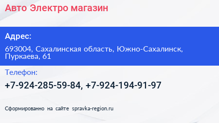 Авто-Электро, магазин по адресу 693004, Сахалинская область, Южно-Сахалинск, Пуркаева, 61 в дальнейшем Организация, размещена в следующих категориях: