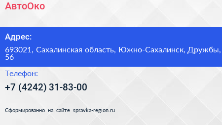 АвтоОко по адресу 693021, Сахалинская область, Южно-Сахалинск, Дружбы, 56 в дальнейшем Организация, размещена в следующих категориях: