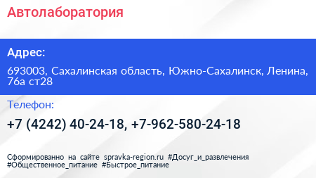 Автолаборатория по адресу 693003, Сахалинская область, Южно-Сахалинск, Ленина, 76а ст28 в дальнейшем Организация, размещена в следующих категориях: