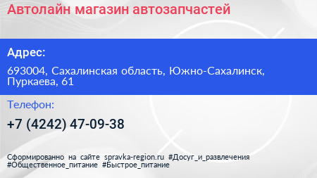 Автолайн, магазин автозапчастей по адресу 693004, Сахалинская область, Южно-Сахалинск, Пуркаева, 61 в дальнейшем Организация, размещена в следующих категориях: