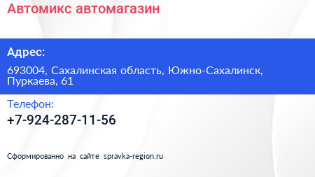 Автомикс, автомагазин по адресу 693004, Сахалинская область, Южно-Сахалинск, Пуркаева, 61 в дальнейшем Организация, размещена в следующих категориях: