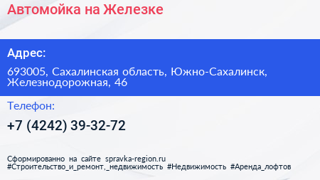 Автомойка на Железке по адресу 693005, Сахалинская область, Южно-Сахалинск, Железнодорожная, 46 в дальнейшем Организация, размещена в следующих категориях: