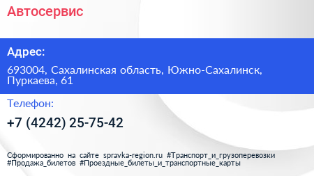 Автосервис по адресу 693004, Сахалинская область, Южно-Сахалинск, Пуркаева, 61 в дальнейшем Организация, размещена в следующих категориях: